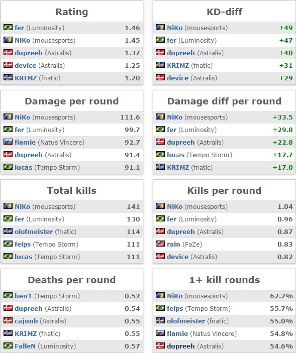 Efter det overståede gruppespil, så tweetede HLTV.org denne stat, hvor folk fra Astralis og Fnatic er med i toppen, da de vandt størstedelen af deres kampe, men mousesports tabte tre af deres fem kampe og Nikola "NiKo" Kovač er utvivlsomt den spiller med størst impact. Bæstet fra Bosnien manglede dog en af de to andre stjerner på holdet viste sig, og det illustreres bedst med deres 17-19 tab til Fnatic på Mirage.